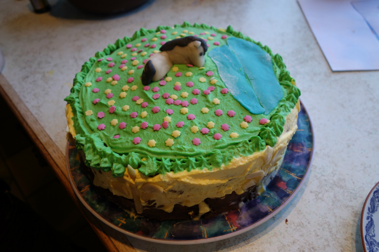 Haha egentligen var det ett tag sen! Men aja, Den här tårtan gjorde jag och en kompis till tårttävlingen på säva den första maj. Den är gjord av två kakbottnar, chockladkräm, mazan, jordgubbar, banan, grädde ( färgad ) och lite dekorations godis. Hästen i mitten är gjord av mandelmassa och vi färgade den och grädden med hjälp av karamell färg. ;) Tyvärr kunde jag inte smaka på den eftersom jag är gluten intolerant.... Men den vart i alla fall bra! ( åtminstone utseendet...) Tyvärr så vann vi inte heller.... bättre lycka nästa år!! :)